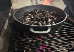 La væsken renne av og ha blåskjellene over i en panne/gryte som kan stå på grillen
